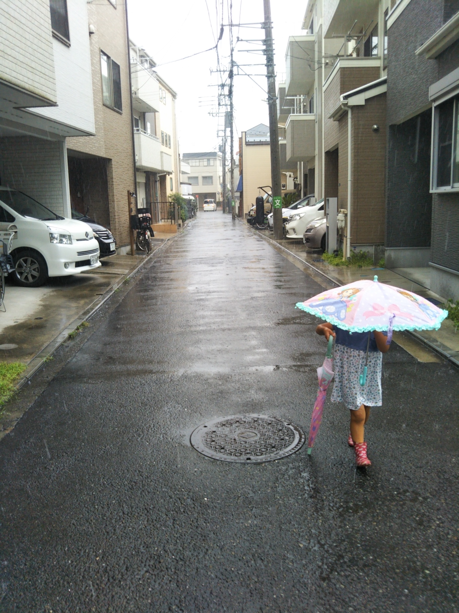 傘を持たないで登校した娘1号。この雨で傘がないとずぶ濡れ必至。2号とともに小学校までお迎えに行きます。