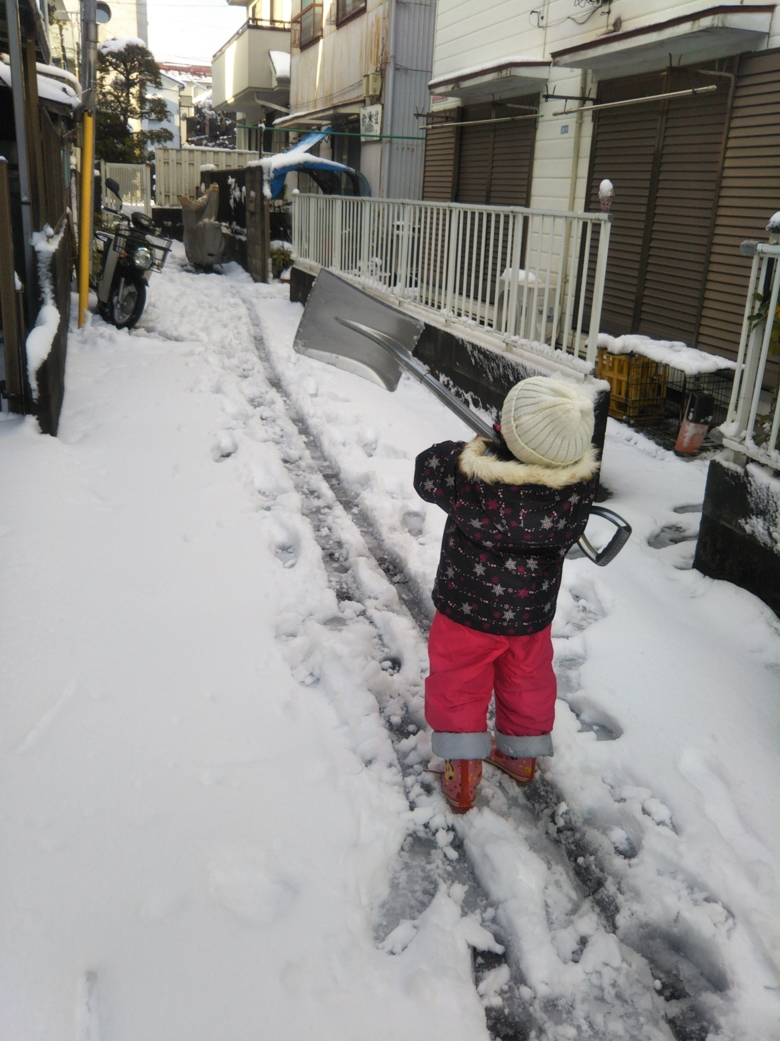 さてノリノリで登校した娘1号を見送った後、幼稚園休園の娘2号を引き連れて家の周りをせっせと雪かきです。