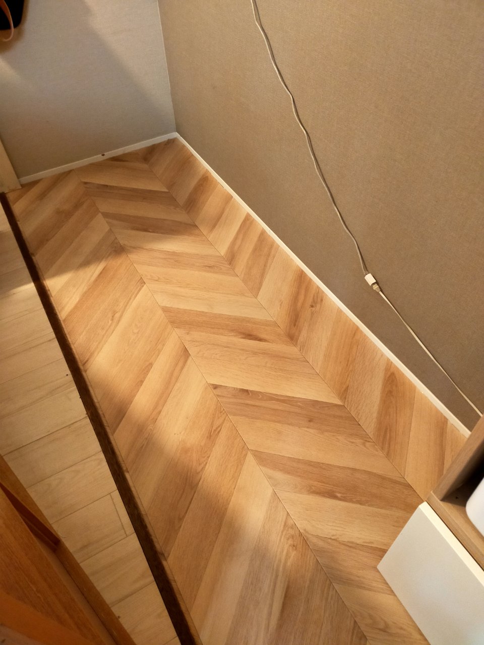 上に棚を置くので目立つほど広範囲ではないのですが、せっかくお気に入りのヘリンボーンを入手できたのでこの亀の上から貼ることを決意!