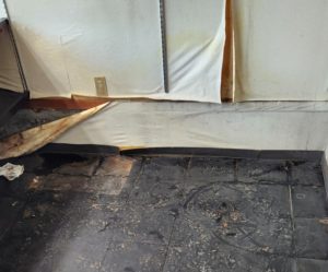 でも聞けば屋根や天井からではなく、お隣と接している壁から水がしみ込んできている模様。動画や写真も送ってくださり、見てみると、たしかに壁が濡れていてクロスもはがれている。そしてその水が床に流れて床材のタイルがぺこぺこしてます。